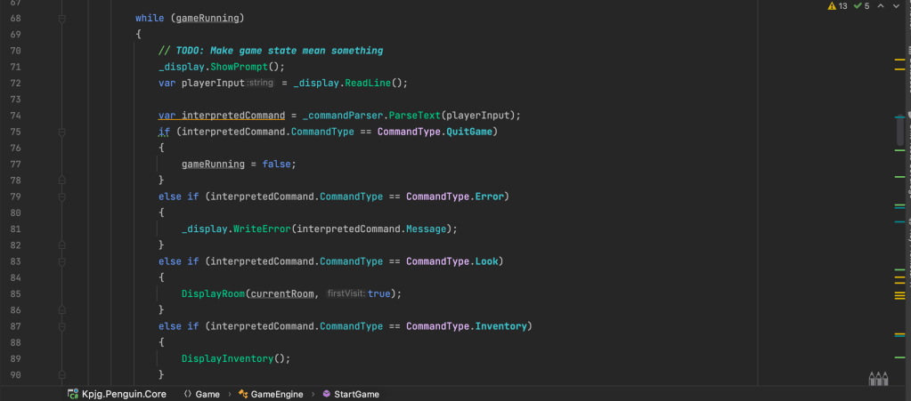 The game portion contains the game data, any special commands the game has on top of the “standard” commands (and how to handle them). The game is also responsible for the implementation of the display engine. The current game implements the display engine as a console application, however the intention is for this to potentially be ported to MonoGame to allow for more interesting graphics (much like Inform and some game engines allow).